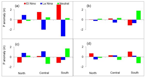 Figure 4. Precipitation (P) anomalies from the long-term averages for three ENSO phases and three regions in Alabama during: (a) winter (Dec-Feb),