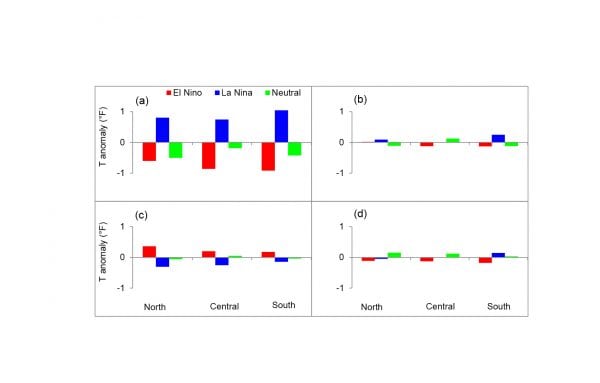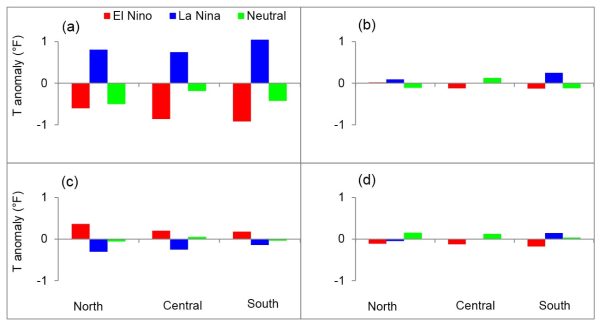 - Summers are hotter than normal in all parts of the state (Figure 5c), and El Niño is the hottest phase.