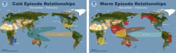 Figure 2. Cool, warm, wet, and dry patterns across the world in winter during cold (La Niña) and warm (El Niño) episodes of ENSO. (Credit: NOAA/NCEP/CPC)