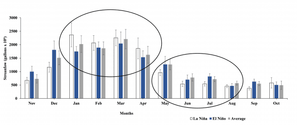 In Alabama, precipitation and streamflows highly depend on the ENSO phase. Growers can use ENSO phase predictions to plan water withdrawals for irrigation and make decisions regarding the crops they will plant in irrigated and non-irrigated fields during the growing season. The relationship between the El Niño phase and streamflow can vary between north and south Alabama. In north Alabama, more water withdrawals could be made in the winter months during the La Niña phase. However, the La Niña phase results in lower precipitation in the summer months, which limits water withdrawals during this time.