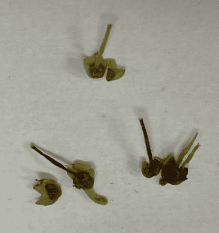 - Figure 7. Cut blueberry flower buds showing a healthy bud (on top) and cold damaged necrotic buds (lowermost).