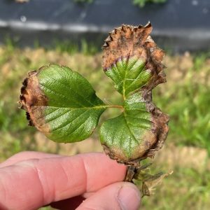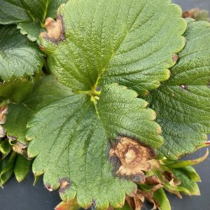 The initial and most prominent symptom is the appearance of target shaped, brown to dark purple spots on the strawberry leaves. As the disease progresses, these spots may merge, forming larger blotches that can cover significant portions of the leaf surface. In severe infections, the affected areas may become necrotic, causing the leaves to wither and die. Severe cases of Gnomonia leaf blotch can lead to a noticeable reduction in fruit size and quality. In rare instances, Gnomonia has been known to cause blotches on fruit. Gnomonia is most often associated with the source of plant material. This pathogen often arrives on plugs but can also survive on plant material left in the field from the previous season.
