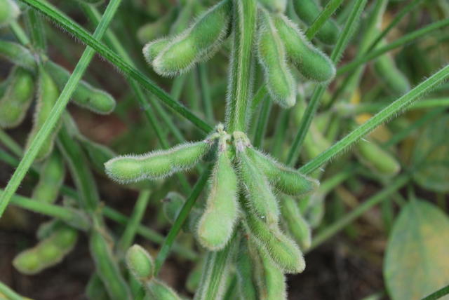 | R3 | Beginning pod | Pods are 3/16 inch long on one of the four uppermost nodes on the main stem with a fully developed leaf. | Scout for insects and diseases. Identify water stress, which affects pod formation. If available, irrigation is critical at this stage through R6. |