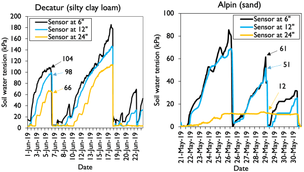For example, if an irrigation depth of 0.6 inch is the preferable and commonly used rate by the farmer, irrigation should be initiated when SWT from the soil sensor reaches 77 and 38 kPa for Decatur (silty clay loam) and Alpin (sand) soil types, respectively (table 1).