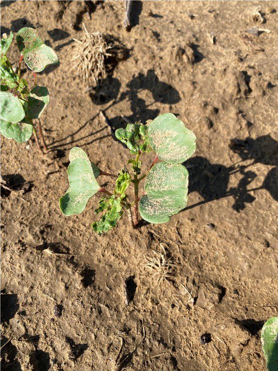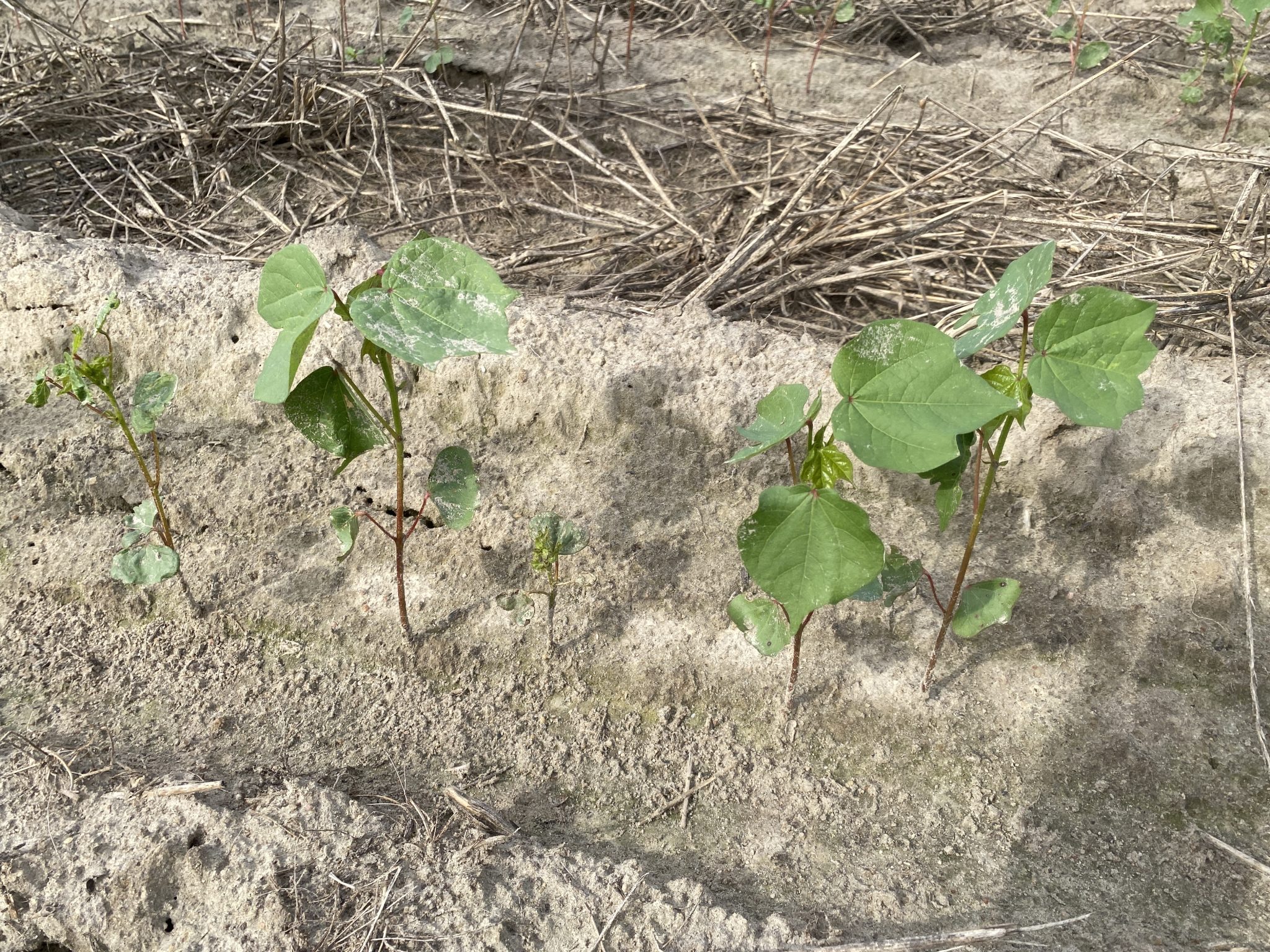 - Figure 3. A non-ThryvOn cotton seedling surrounded by ThryvOn cotton seedlings. No at-plant insecticides were applied.