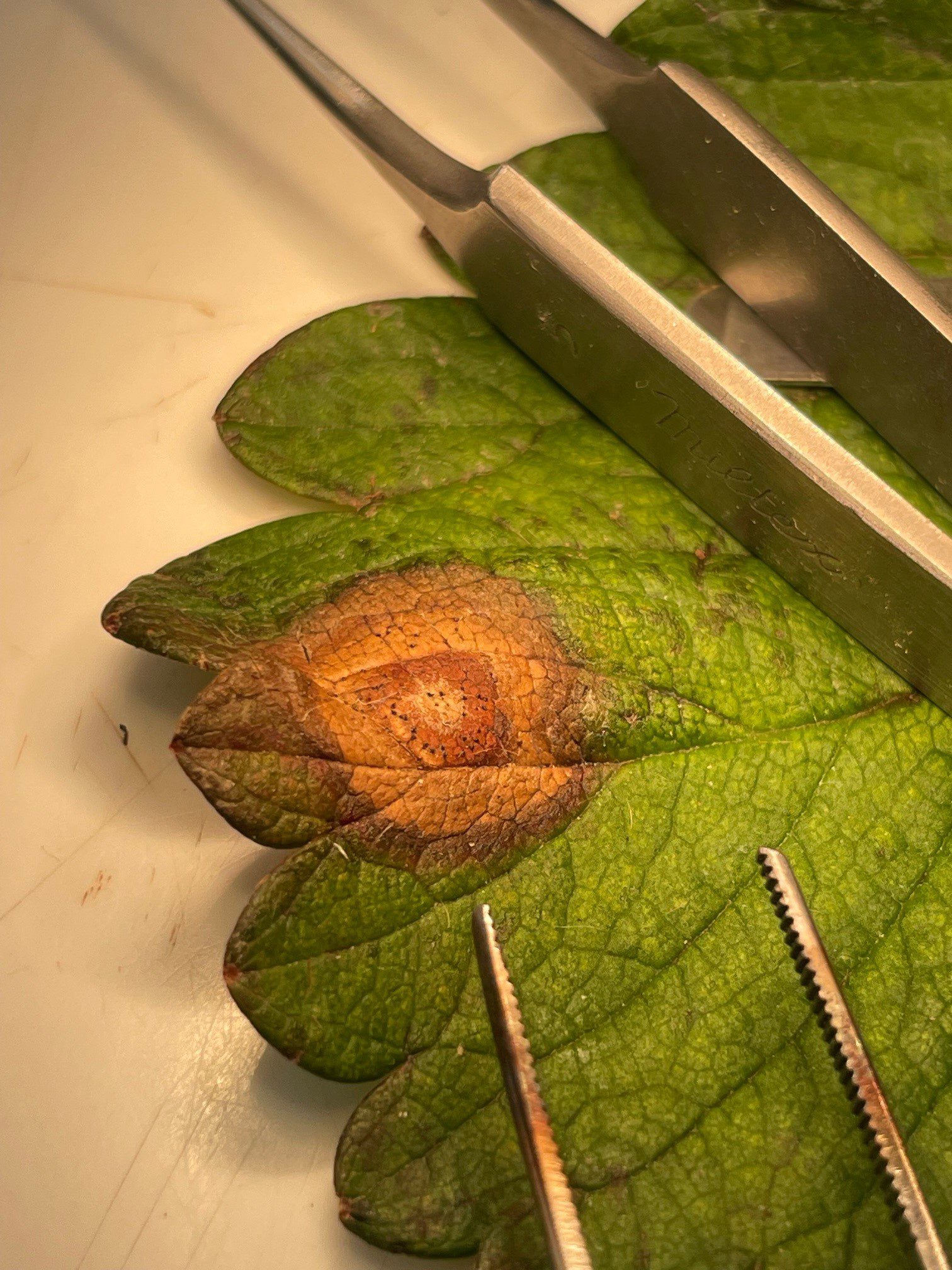 Neopestalotiopsis causes leaf and fruit spots initially, and it eventually infects roots and crowns, causing the plant to wilt and die. Leaf spots can be tan-to-dark brown, various sizes, and irregularly distributed on infected leaves. Black fruiting bodies, similar to grains of pepper, become visible within the lesion under moist, humid conditions and are visible with a hand lens.