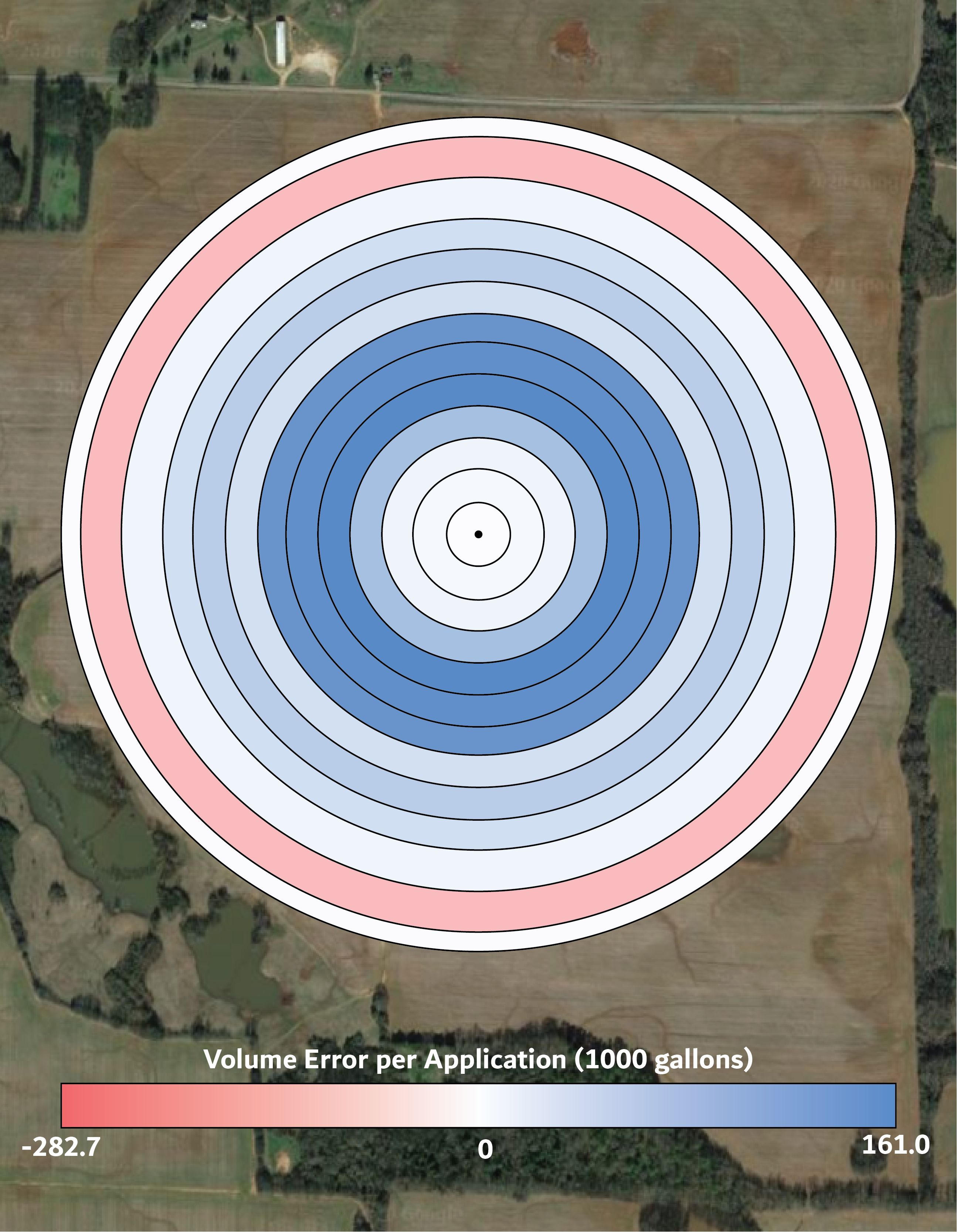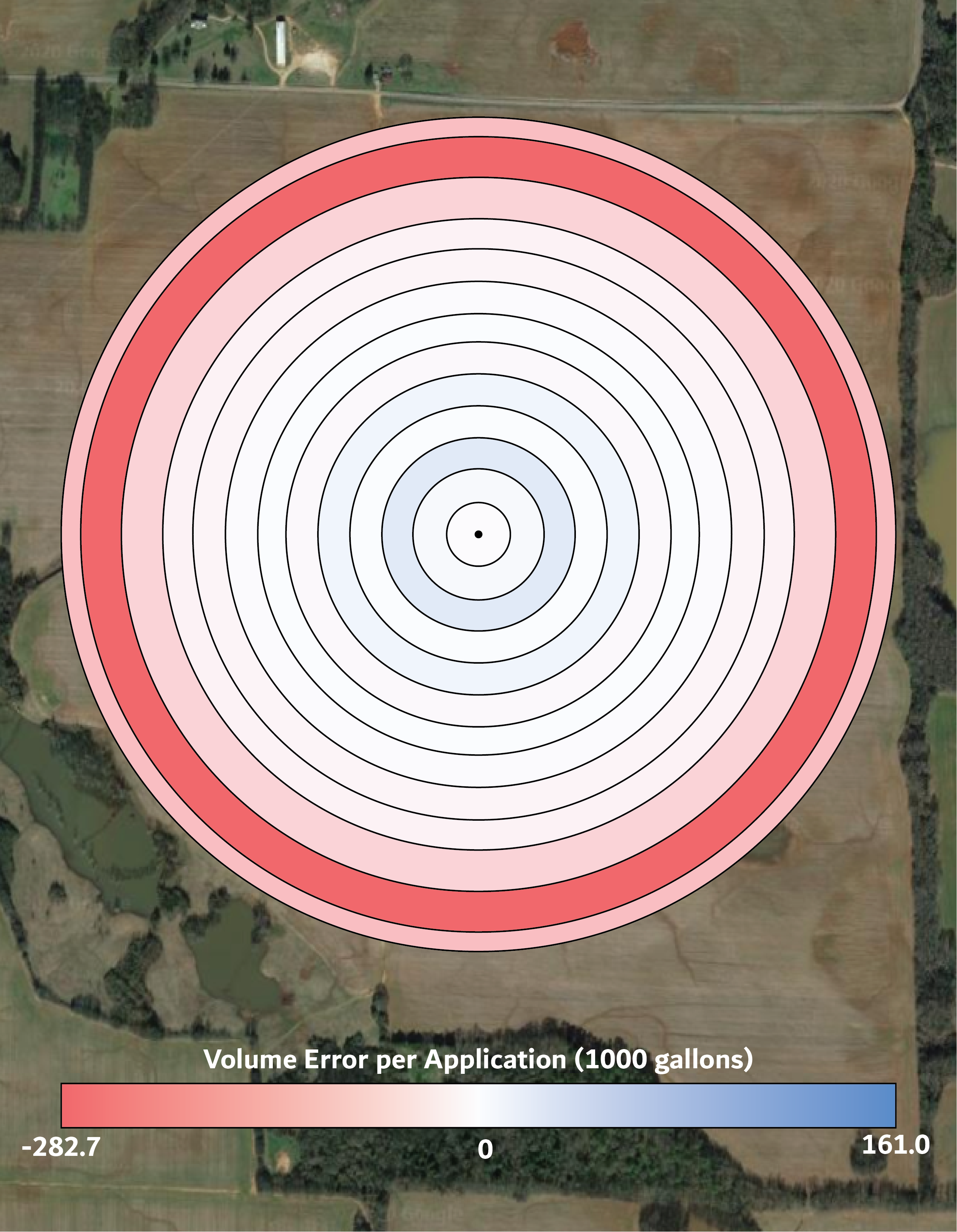 The impact of operating a 2,036-foot center pivot irrigation system below the designed pressure was studied in 2020. In the study, surface water was pumped from a creek into an irrigation pond and from the pond to the pivot. The pivot had 12 spans plus the overhang and 219 sprinklers equipped with low-pressure spray heads, rotating deflection pads, and 15-pound per-square-inch (psi) pressure regulators (figure 3). According to the sprinkler chart, the system was originally designed to pump water at a pressure of 80 psi and a flow rate of 1,500 gallons per minute (GPM). However, the farmer was only able to pump water at 50 psi; therefore, an analysis was conducted to determine how reduced psi affected water application. Reducing the operating pressure from 80 to 50 psi caused overapplication of water, 18 percent on average, throughout the entire system but especially on spans 4 to 7 (53 percent average overapplication). The dark blue rings in figure 4 show where the overapplication occurred. Since the sprinkler chart showed the system was originally designed for a pumping pressure of 80 psi, it was determined that the nozzle sizes were too large when the pump was operated at 50 psi. For example, the original sprinkler chart for an 80-psi pump recommended a 30-32 nozzle size for sprinklers 42 to 50 (span 5). However, if the pivot is operated at 50 psi, 25-26 nozzle size should be used for the same sprinklers. To prevent this specific problem, irrigation operators should frequently check the pump pressure (manually or automatically) and monitor water source levels (well or pond) to identify potential impacts to pumping pressure.