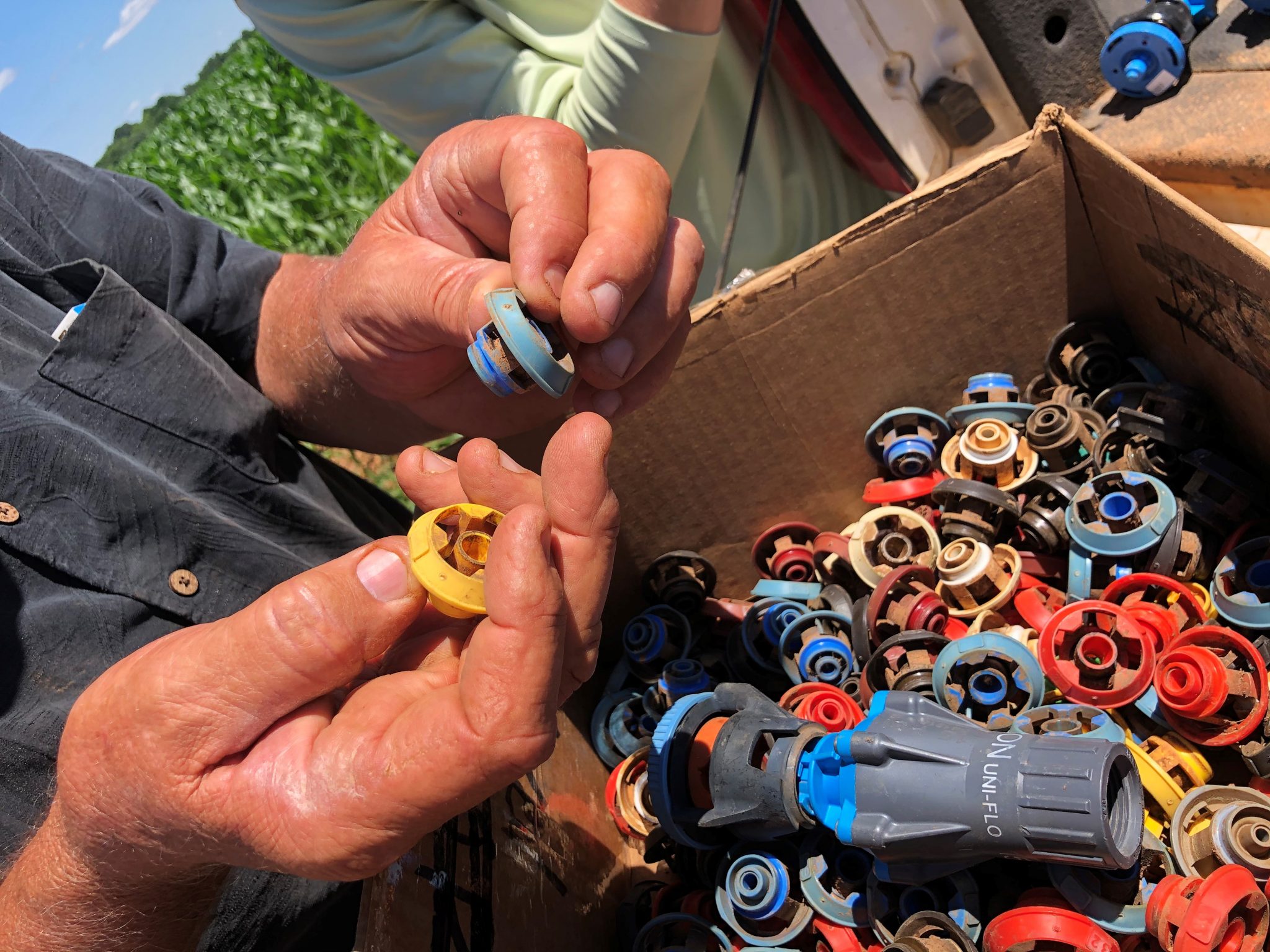 The color of the nozzles corresponds to different nozzle sizes, and the shape and color of the spray plate indicate a specific width of throw (figure 5). Nozzle size and plate shape are designed for specific pressures; therefore, when replacing a missing or worn sprinkler, it is important to check the sprinkler chart to select the right nozzle size and type according to the specific sprinkler number on the pivot. A uniformity of water application test was conducted in 2020 to evaluate how nozzle size or catch can test affects the uniformity of application. The same 2,036-foot center pivot irrigation system was used for this test. Because the farmer could only operate the pump at 50 psi, a redesign of the sprinkler chart was necessary; however, over the years, nozzles along the pivot pipeline were not always replaced with those matching the sprinkler chart.