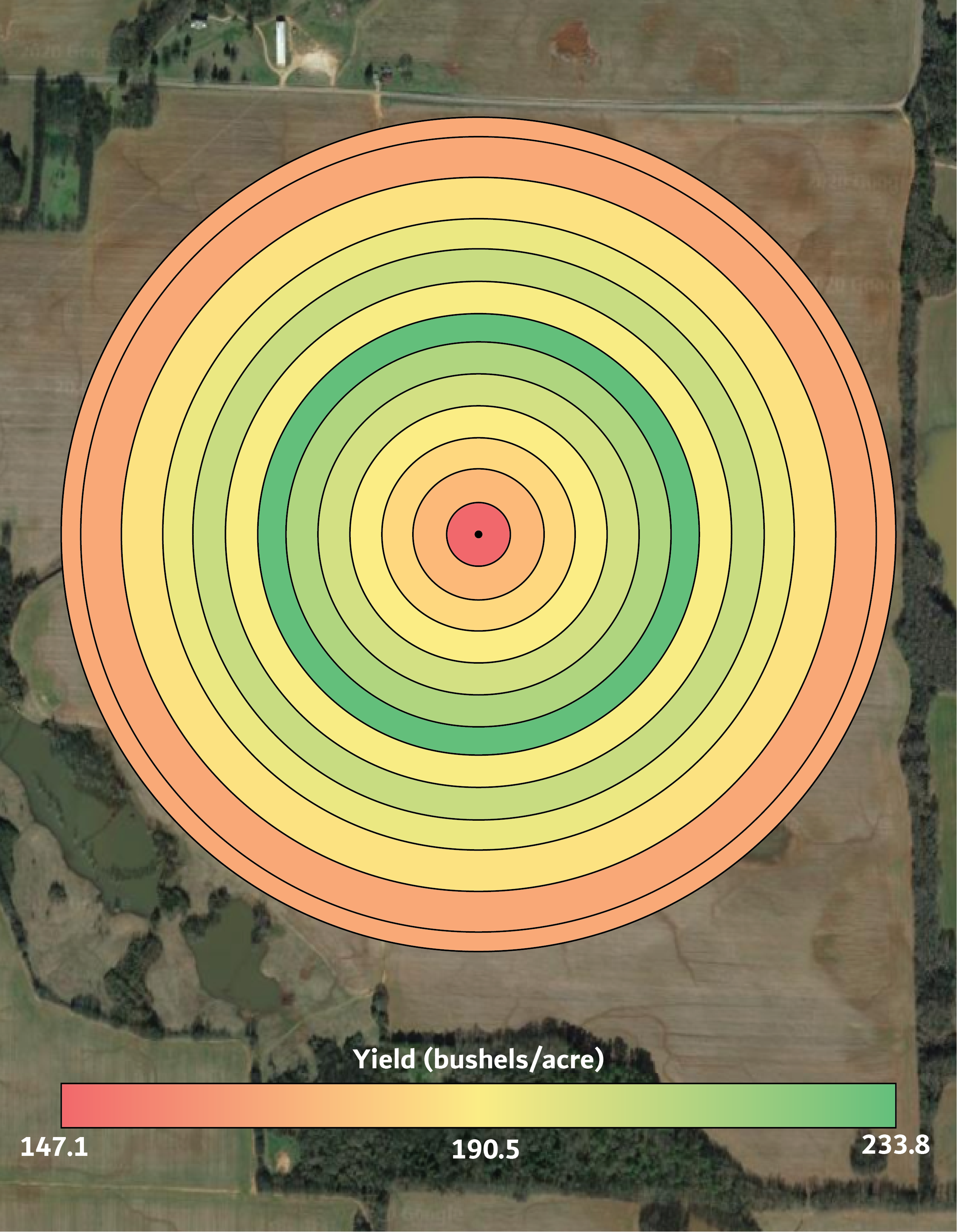 Dryland areas surrounding an irrigated field are also a clear indicator of the benefit of irrigation—where irrigated yields are similar to dryland yields, there is potentially a problem with the irrigation system. As shown in figure 8, assuming the dryland corners were managed with the same production practices as the irrigated area, the farmer incurred negative net returns on average. There were small areas of positive net returns above variable costs in the dryland corners; however, these areas were a minor portion of the dryland area. The net returns depend on the corn price and production costs, which do differ by producer. Growers should keep records of production costs associated with the dryland areas of irrigated fields as it may be financially beneficial to leave those areas fallow or enroll them in a conservation program.