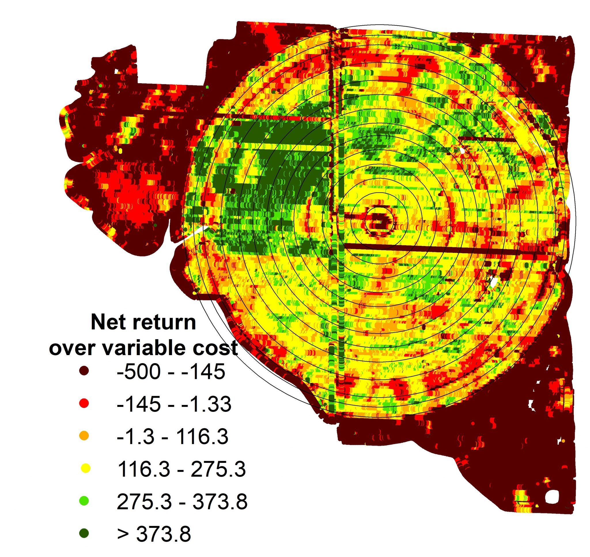 - Figure 8. Spatial analysis of net returns across irrigated and dryland areas shows the economic impact of irrigation and pivot maintenance.