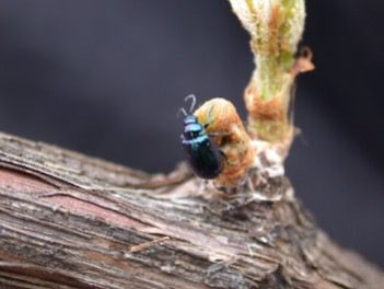 Grape flea beetle is often the first insect pest in the season to begin attacking grapes. This shiny, metallic dark blue beetle is found in the eastern two-thirds of the United States. Adults damage the swelling buds by hollowing them out. Damaged buds will not develop into primary canes, which can reduce grape yields. This severe injury to the developing buds can cause economic losses in some years. The level of injury is worse when cool temperatures slow bud development. Once the buds are 1/2 inch long, only slight injury is caused.