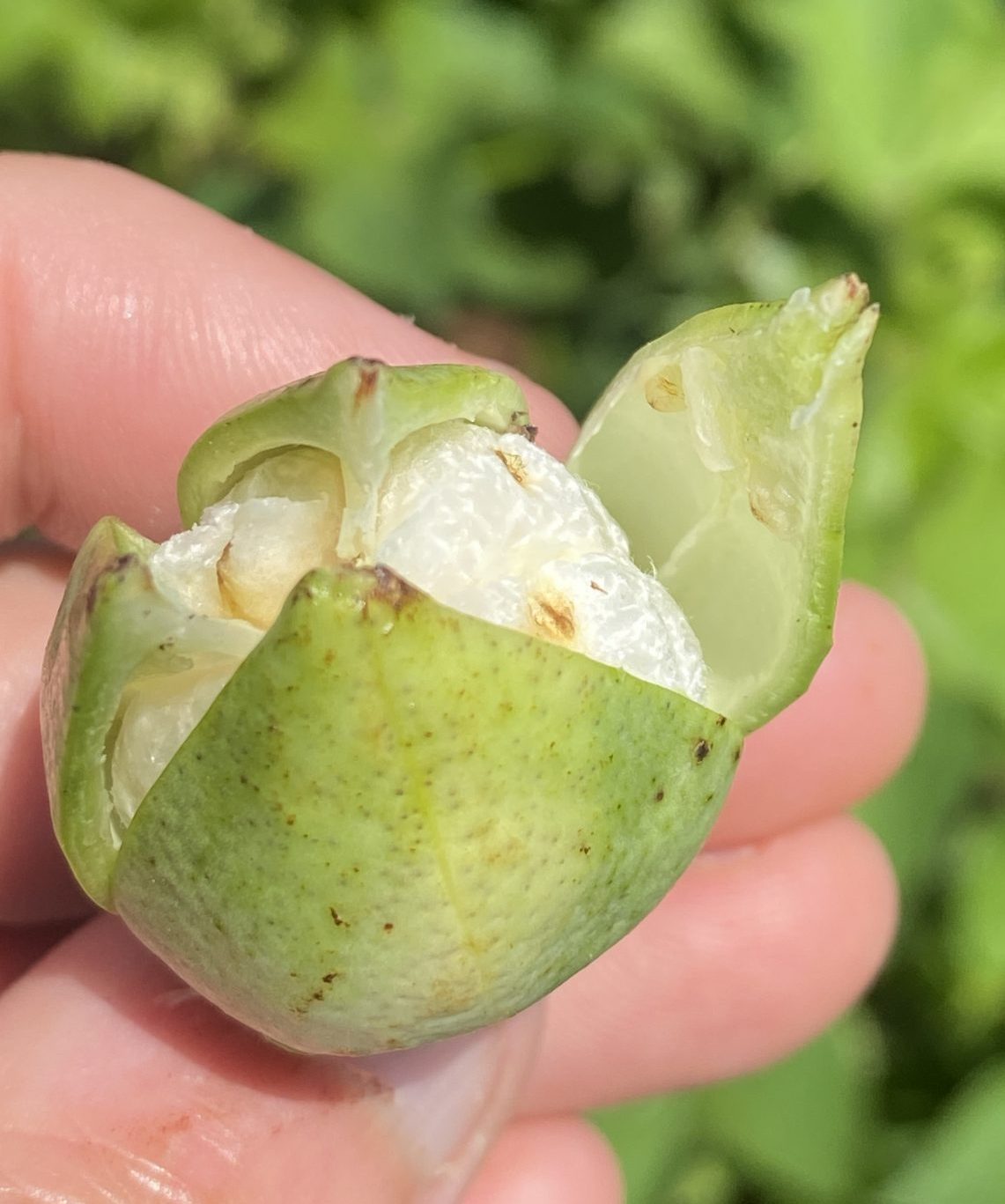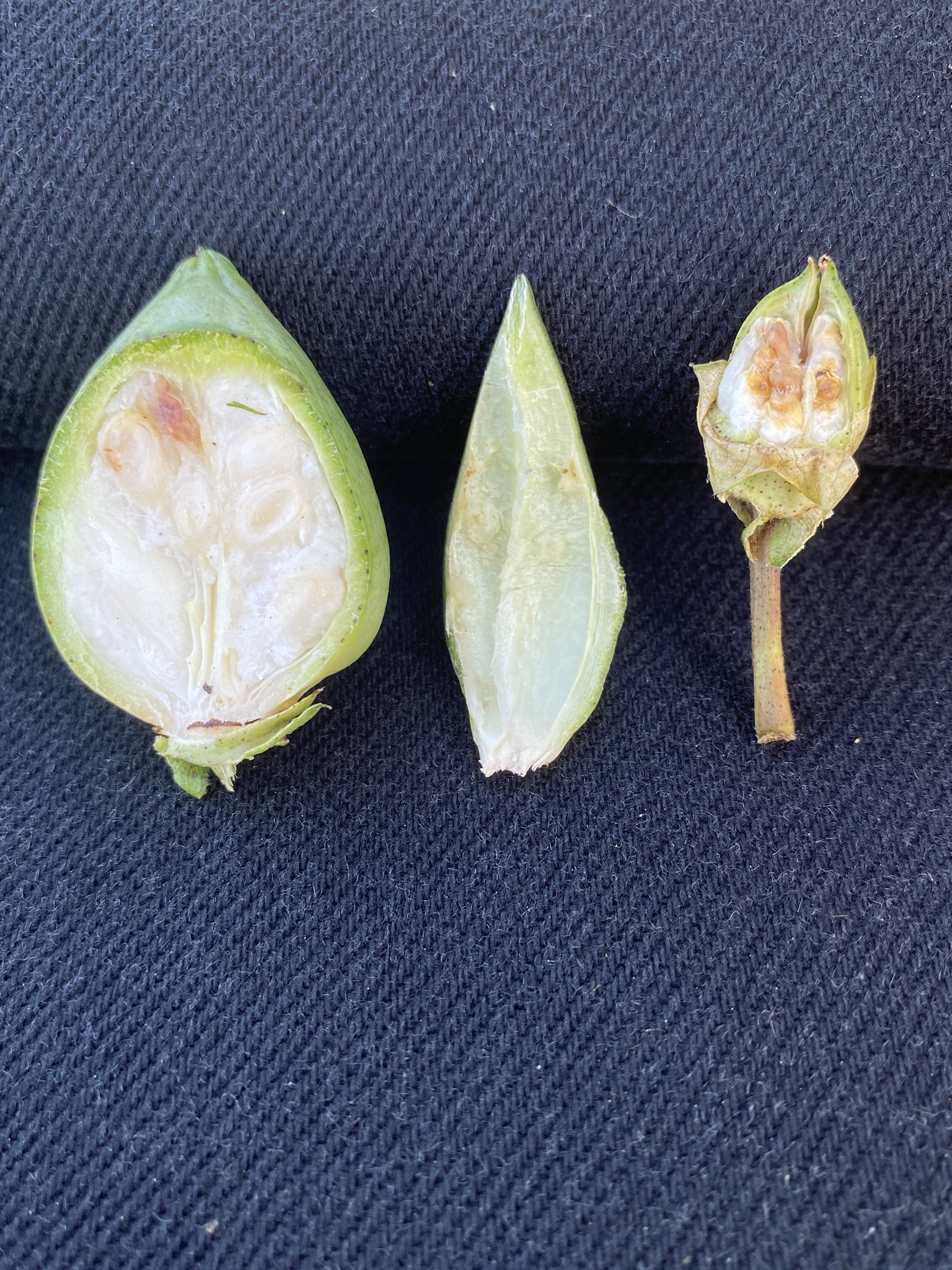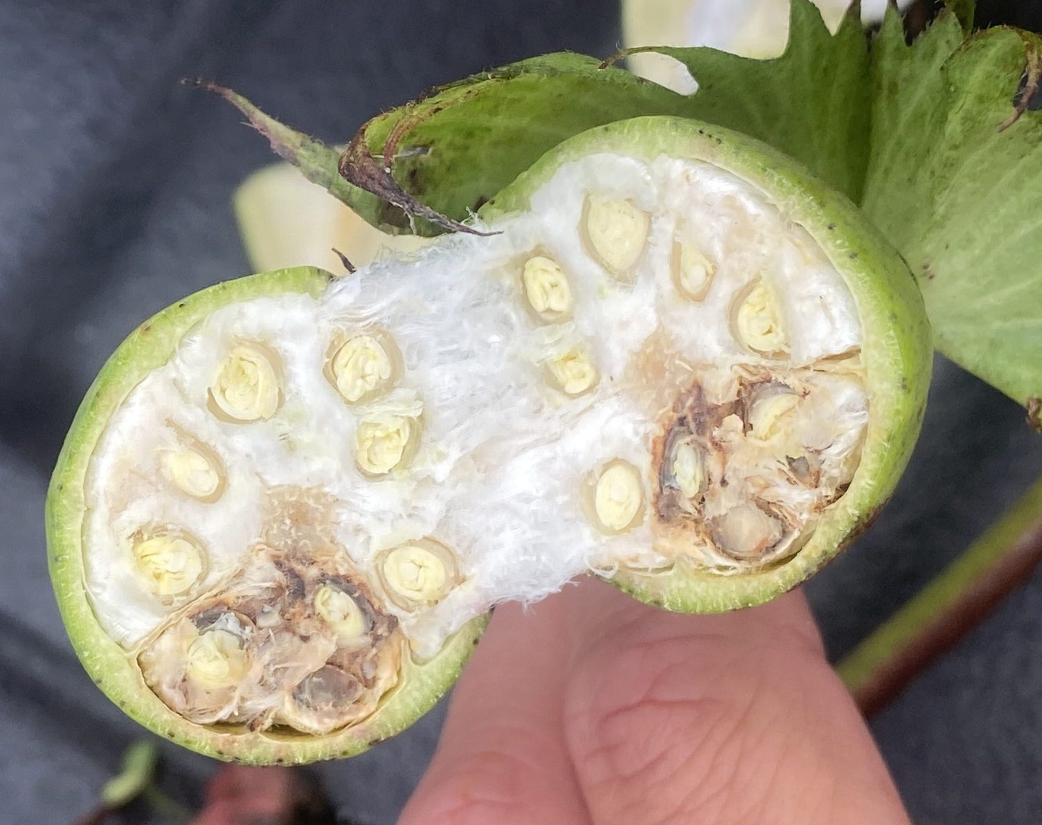 Bolls injured internally by stink bugs may have warts or small pinprick spots on the inside of the boll wall (figures 10 to 13). These pinprick spots may serve as an avenue to introduce boll rot organisms. Developing lint may be stained a tan, yellow, or brown color near a developing seed. Indications of this are often, but not always, located directly underneath outer stains and inner boll wall injury (figure 14). Injury from stink bugs may result in locks that are not harvestable, evidenced by hardlock bolls that fail to open or increased incident of boll rot pathogens entering developing bolls (figure 15).