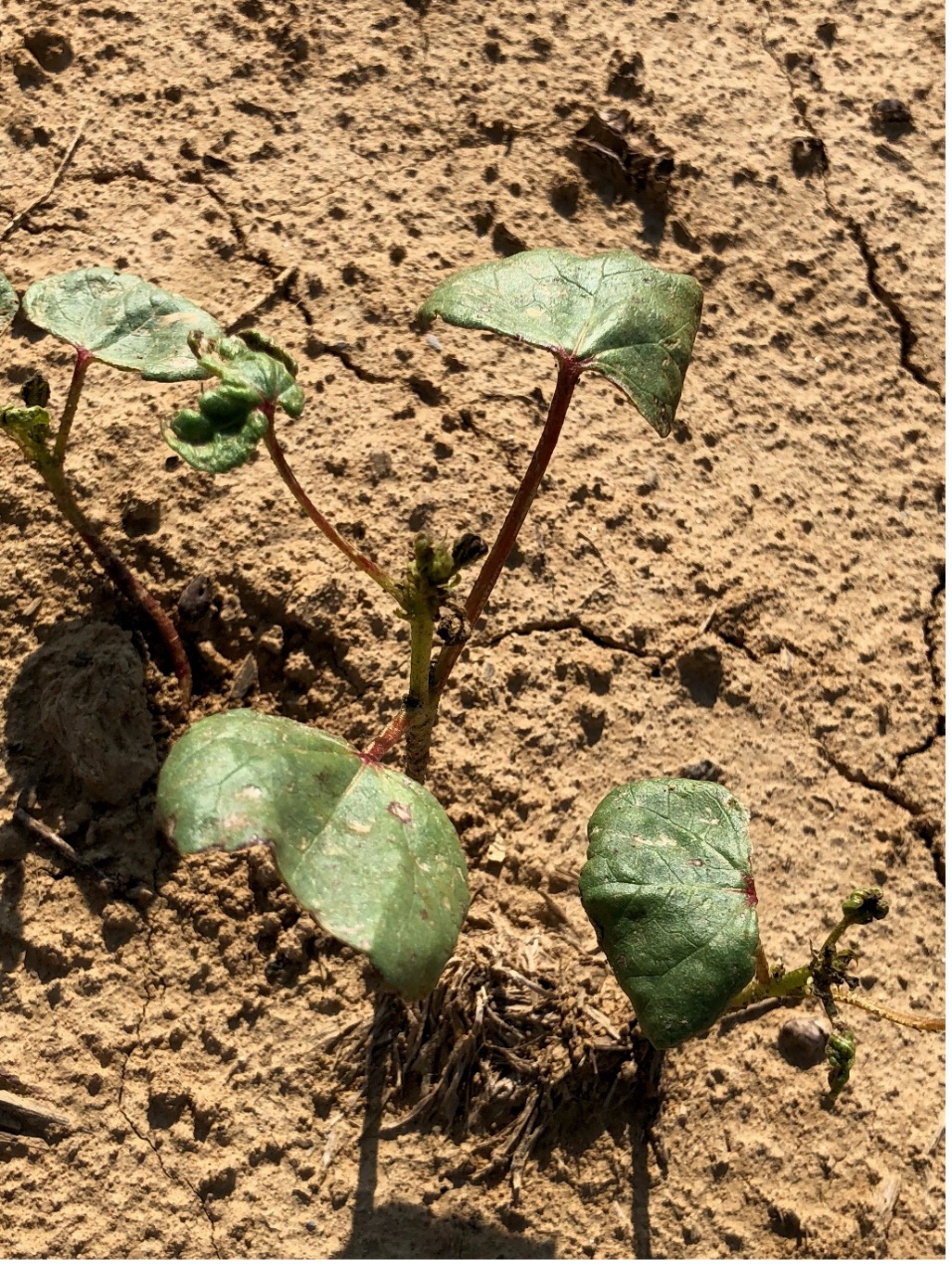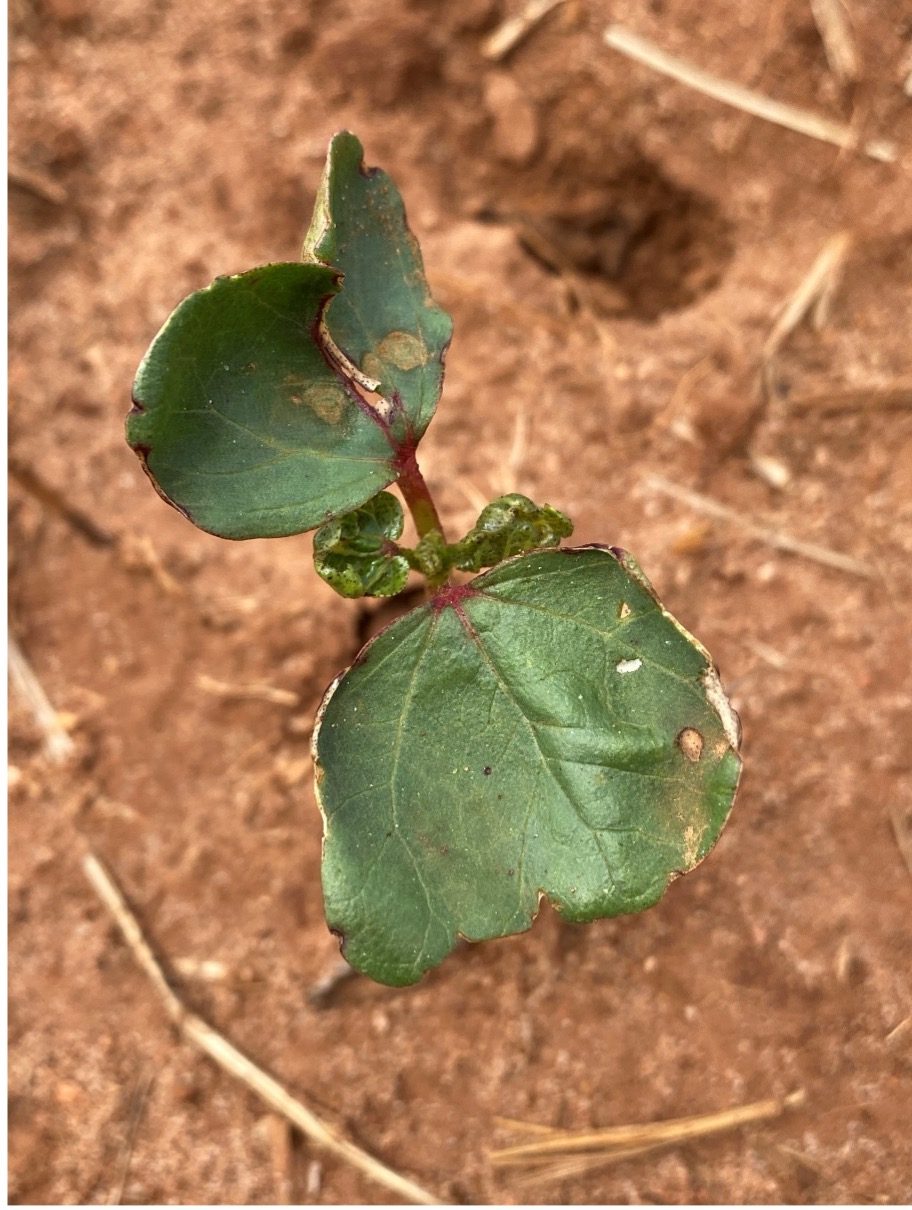 Thrips are the most significant insect pest of seedling cotton in Alabama. Cotton is generally susceptible to thrips injury from emergence until the fourth or fifth true leaf stage. Substantial thrips injury is common when environmental conditions are not favorable to cotton seedling growth and development. Among the most important factors resulting in significant thrips injury to cotton is cool nighttime temperatures, when plant growth is slowed. Thrips injure cotton seedlings by rupturing plant cells with their rasping and sucking mouth parts. This gives leaves a characteristic silvery sheen and upwards curl. The curling of leaves occurs because thrips feed in the cracks and crevices of cotton leaves that are still furled. When the leaf expands, cells that are killed by thrips do not grow, while undamaged cells do, leading to the upwards curl. Excessive thrips injury may lead to crazy cotton, which occurs when the terminal is killed and the plant loses apical dominance. More often, injury leads to delayed maturity, which can increase the likelihood of issues later in the season. When left untreated, heavy infestations of thrips can kill cotton seedlings.