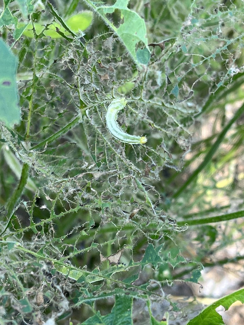 Soybean loopers are one of the most economically damaging caterpillar pests of Alabama soybeans. Although soybeans are susceptible to damage throughout the entire growing season, soybean looper infestations are more common later in the year (August through September). Soybean loopers damage soybean plants by feeding on the leaves, defoliating the plant. Signs of feeding are observed in the lower part of the plant canopy first, as this is where eggs are laid. As damage increases, upper portions of the canopy also begin to be defoliated. Typically, soybean loopers feed between the leaf margins, leaving leaves with a characteristic windowpane appearance. This feeding pattern is easily distinguishable from other defoliating caterpillar pests that consume the entire leaf. Defoliation in large amounts can significantly reduce yield by decreasing transpiration and photosynthetic activity. Soybeans are more susceptible to yield loss from defoliation during the reproductive stages because these stages are when the plant puts most of its energy into seed development.