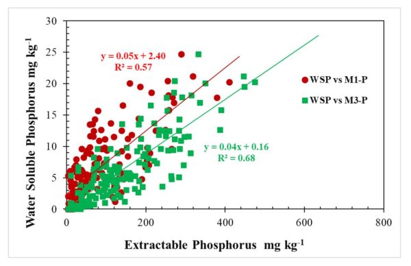 Figure 1. Relationship between water-soluble phosphorus (WSP) with Mehlich-1 phosphorus (M1-P) and Mehlich-3 phosphorus (M3-P) for surface 0–5 cm soils.