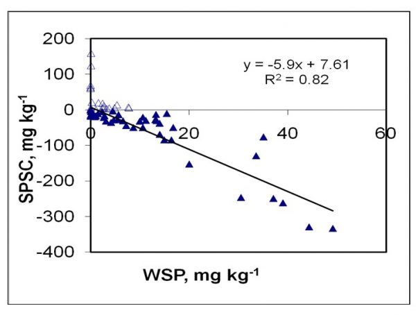 From Figure 3 we see that water-soluble phosphorus is minimal as long as soil phosphorus storage capacity is positive. However, water-soluble phosphorus increases linearly with increase in negative soil phosphorus storage capacity numbers. Soils with negative soil phosphorus storage capacity have a greater risk of dissolved phosphorus loss during storm events that can potentially have a negative impact on nearby water bodies.