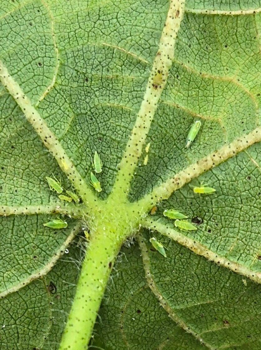 Unfortunately, differentiating immature cotton jassids from other species of leafhoppers is difficult until they reach later instar stages. That’s when the two black spots can be seen near the wing pads. Thus, proper identification of adults is important. Knowing adults are present provides an idea of the exact species of any immature leafhoppers that are present.
