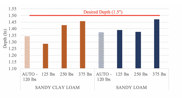 Figure 1 shows the differences in seeding depth with respect to different downforces evaluated. Data show that in sandy clay loam conditions, seeding depth increased as the downforce increased. But on sandy loam soil, there were no seeding depth differences except for the highest downforce (375 pounds) treatment.