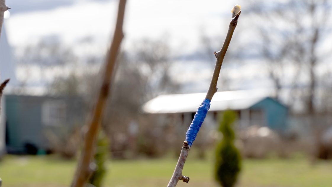 Properly care for scions after grafting. Grafting tape is helpful when wrapping scions. Animals and wind can break a newly grafted tree, but tying the new shoot to a stake can help.
