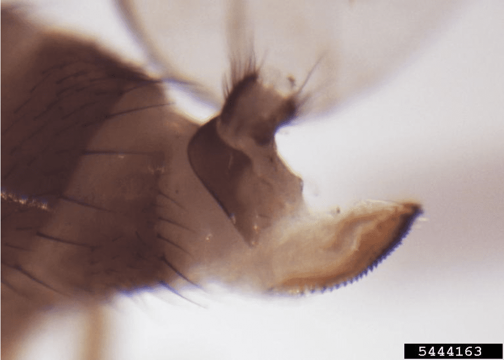 - Figure 1c. The saw-like ovipositor of an adult female SWD. Photo credit: Hannah Burrack, North Carolina State University, Bugwood.org