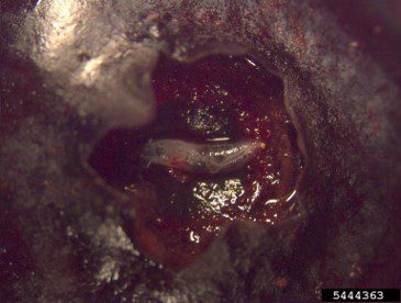 - Figure 2. Developing SWD larva on a blueberry. Photo credit: Frank A. Hale, University of Tennessee, Bugwood.org.