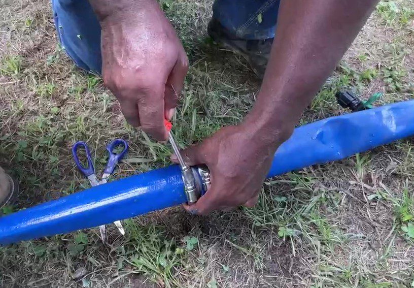 Step 3. Use a coupling or barbed splice fitting to join the two parts back together. Take two clamps and insert them on both sides of the pipe. Insert the barbed splice fitting into one side and then the other. Push both sides of the lay flat together over the fitting. A little vegetable oil will help the lay flat slide on the fitting.