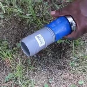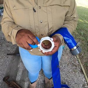 Step 3. Place the clamp on the lay flat pipe. Put the barbed cap inside the end of the pipe. This part can be tricky, so gently twist and push the connector in until the pipe is snug against the connector fitting. Food grade lubricant such as vegetable oil on the outside of the connector can help it slide on the pipe.