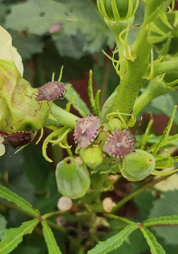 Feeding incisions by adults and the second through the fifth nymphal stages are very difficult to detect. An early attack on plants leads to premature fruit abortion in some fruit. Detection of BMSB damage is difficult during later stages, often going unnoticed until fruit shows symptoms of cat-facing. To detect BMSB damage, the whole fruit or pod needs to be checked. For the fruit to be inspected, it must be sliced. BMSB damage can also be detected by shaking tree branches and plant parts early in the morning and by visual inspection of the hiding places of diapausing adults. In the summer of 2024, we recorded high numbers of BMSBs in okra.