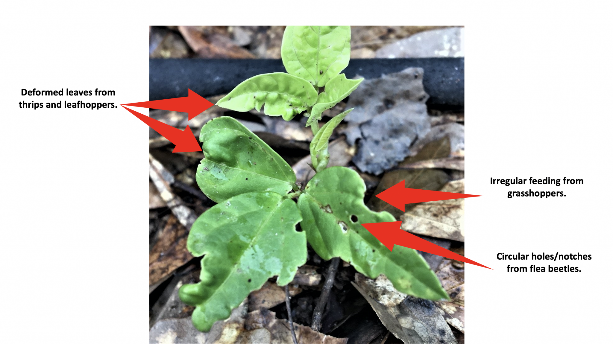 Flea beetles are a minor pest concern in legumes but they may attack seedlings in gardens. Flea beetles are small beetles that jump off seedlings when approached. They build up in the soil over many years and feed on many cultivated crops and weeds. Unlike thrips and leafhoppers, flea beetles generally feed on top of leaves to cause tiny round holes (shot-hole symptom). Peas generally grow fast in good conditions and are not stressed with flea beetle infestations in later stages.