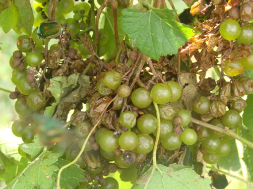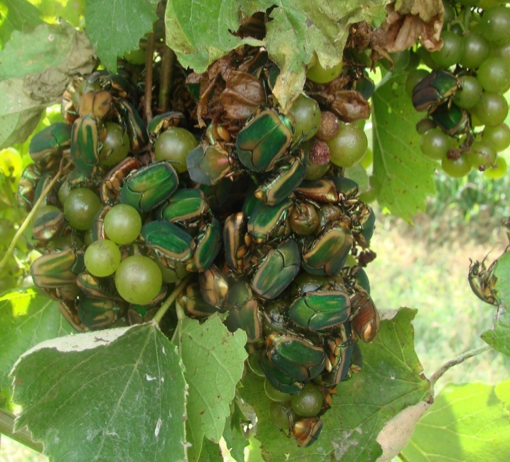 Completely dried up grape clusters are observed after Green June beetle feeding (Figure 2).