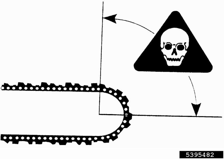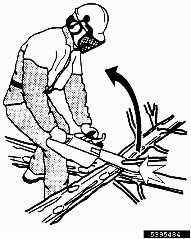 - Figure 23. The chainsaw’s kickback zone or no-go portion should not come in contact with trees or branches while the chain is rotating. If it does, it can create a violent upward rotation that can strike the operator in the chest or head. (Photo credit: International Society of Arboriculture, Bugwood.org)