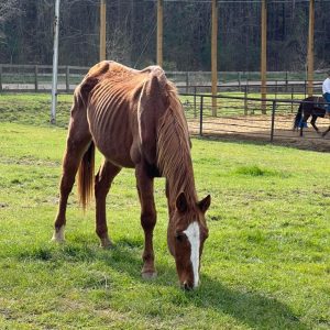 Changing a horse’s BCS takes time, but it can be done when paying attention to exercise and dietary needs. Working with a veterinarian and equine nutritionist can help determine the best course for achieving an appropriate BCS, as some challenges exist when dealing with secondary morbidities, such as laminitis. In general, horses that are obese should have a gradual increase in exercise and a decrease in digestible energy. This can be achieved by monitoring what the horse eats and, depending on the situation, restricting intake using a grazing muzzle, dry lot, or weighing hay. Thin horses should have dietary alterations made gradually, as horses chronically in a nutrient deficit can suffer from refeeding syndrome if reintroduced to rich feeds too rapidly. The University of California–Davis evaluated refeeding-emaciated horses using three different diets and created a protocol called UC Davis Recommendations for Refeeding a Starved Horse, which is commonly called The Emaciated Horse Diet. This protocol is widely used by equine rescue organizations, veterinarians, and nutritionists in cases of severe emaciation and outlines feeding an alfalfa hay-only diet until the horse is healthy enough to consume other feedstuffs.