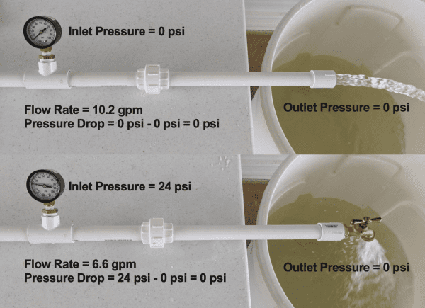 In a pipe system, a pressure drop occurs when frictional forces act against a fluid (water or gas) flowing through a pipe or valve. As the diameter of the pipe gets smaller or the fluid has to make tight turns, such as in a hose bibb, it takes more pressure (power) to maintain a given flow rate. The pressure drop across a valve is determined by subtracting the outlet pressure from the inlet pressure as shown in figure 4. If the valve is open to the outside air like a hose bibb filling a bucket, the outlet pressure would be 0 gauge pressure.