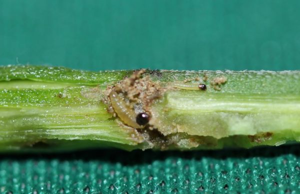 In many cases, the destructive life stage is the larval (immature) form of the pest. Boring larvae spend most of their time protected inside the leaf stem, feeding and causing damage, emerging only to pupate and turn into an adult. These boring larvae are protected inside the stem and cannot be managed by insecticides.