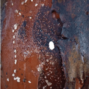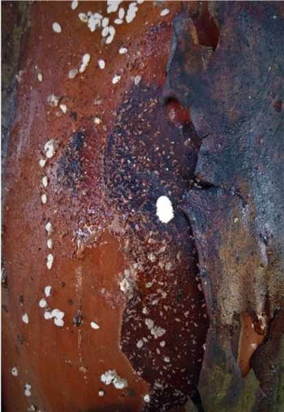 - Mealybug destroyer larva (larger white patch) on a Crape Myrtle trunk covered with CMBS and honeydew.