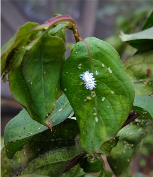 Ladybugs begin life as a yellow-orange cluster of eggs on the underside of leaves. The eggs hatch into small larvae in three to seven days and begin to search for food. These larvae resemble tiny alligators, which can be helpful when identifying them. However, the larvae of mealybug destroyers, a type of ladybug, are white and can sometimes be confused with adult CMBS. Initially these two resemble, but the mealybug destroyer larva is larger and mobile, where CMBS adults are white but they do not move.