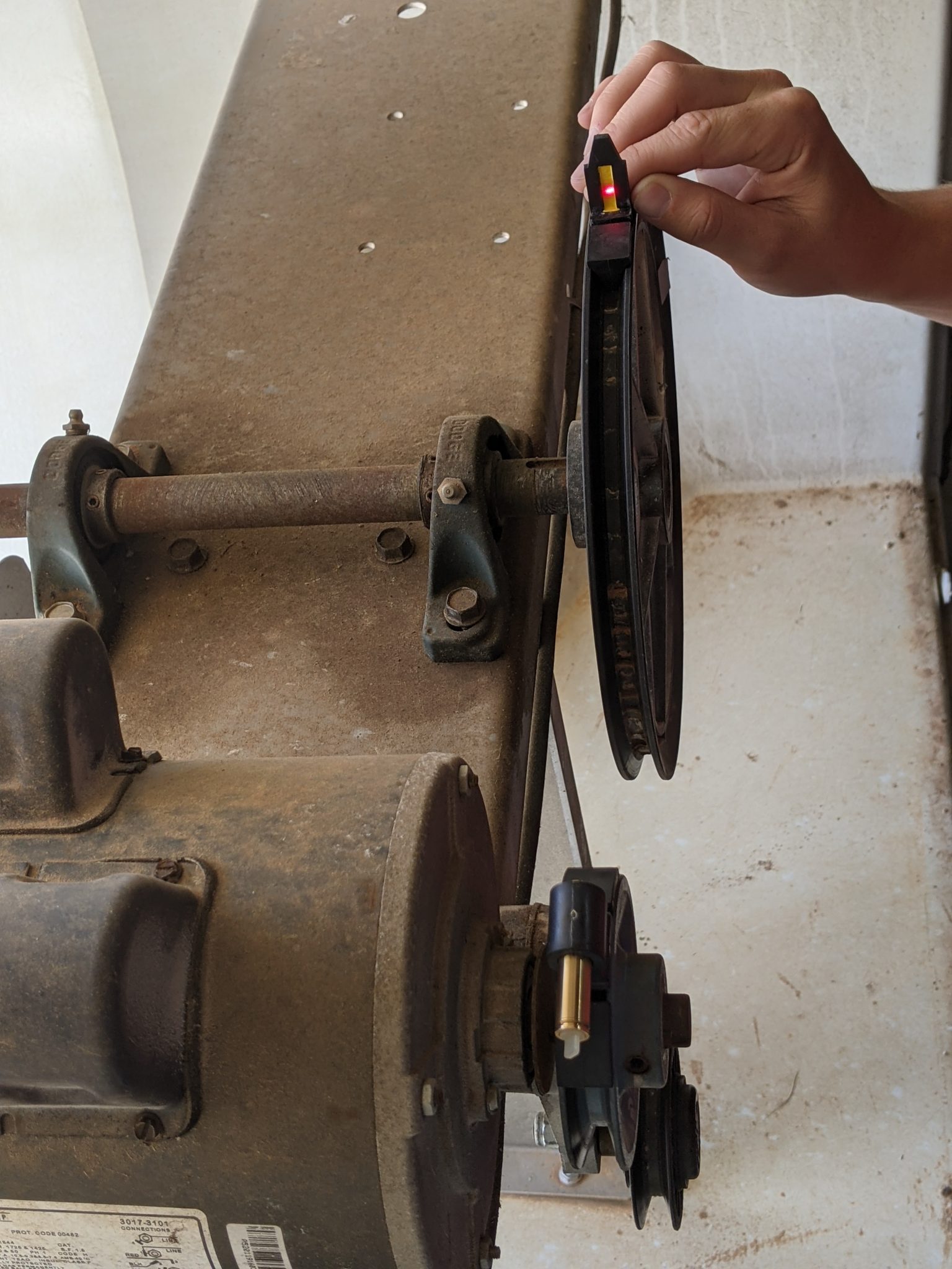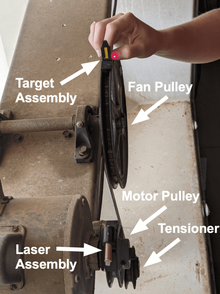- Figure 10. A laser alignment kit is placed on a tunnel fan to evaluate alignment. The laser body is on the motor pulley and the target body is on the fan pulley.