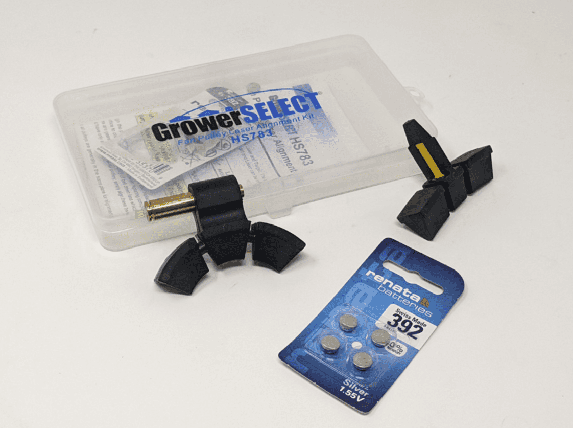 - Figure 9. Laser alignment kit (Grower Select model HS783) including a laser assembly (left), number 392 batteries, and a target assembly (right). Each assembly fits into the v-groove of each pulley.