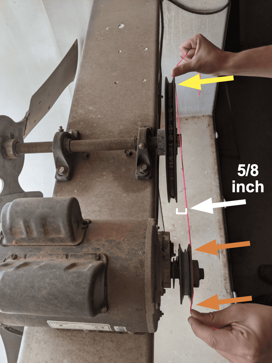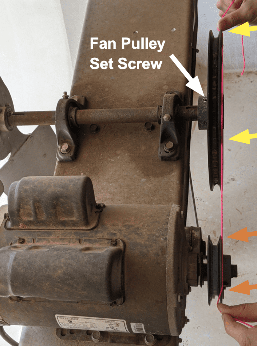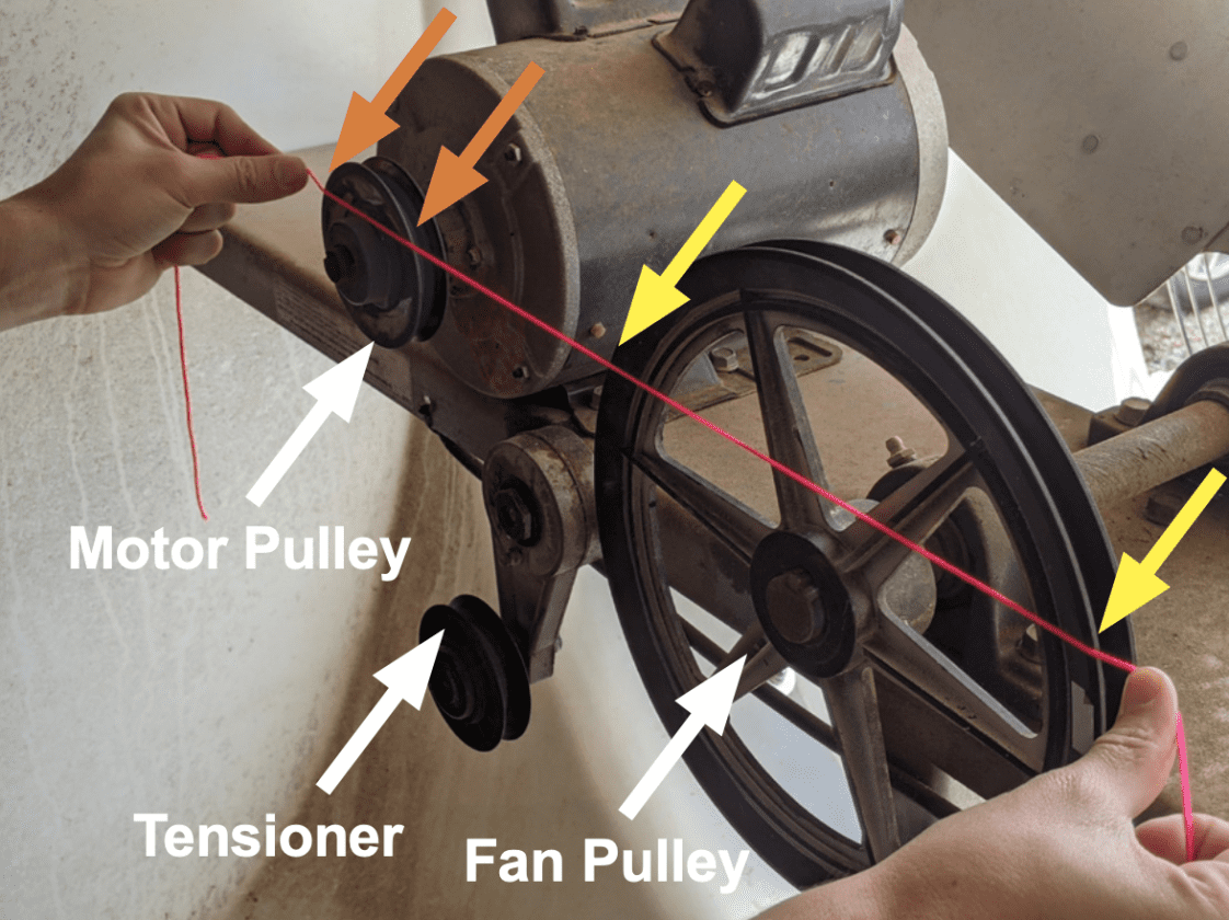 - Figure 3. A 3-foot piece of bright nylon construction string is stretched across the face of both the motor pulley and fan pulley. The fan belt has been removed during this check. You want to have four points of contact (shown by orange arrows for the motor pulley and yellow arrows for the fan pulley). Make sure not to lap over any raised areas near the shaft, this will give a false reading.