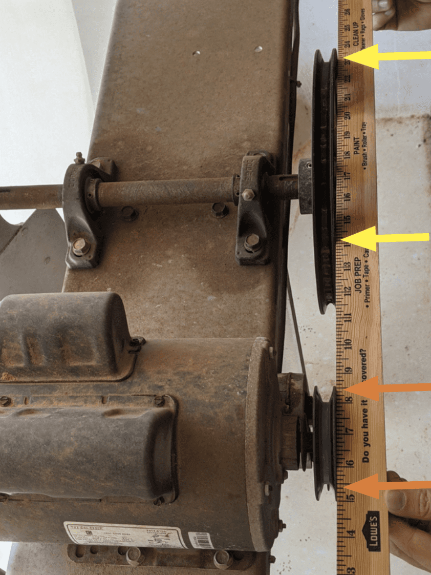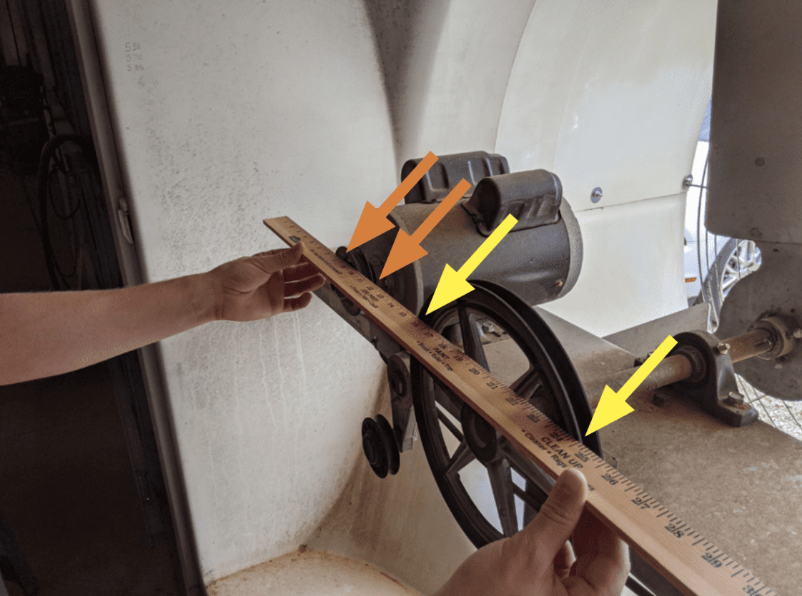 - Figure 6. Hold the yardstick across the face of both the motor and fan pulleys. We have removed the fan belt during this check. You want to have four points of contact (shown by the orange arrows for the motor pulley and yellow arrows for the fan pulley). Make sure not to lap over the raised area near the shaft; this will give a false reading.