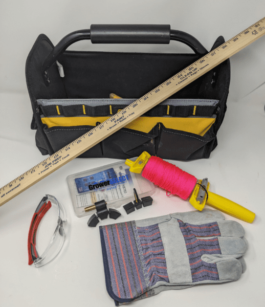 Figure 1. Tools to check fan pulley alignment: nylon construction string, yardstick, laser alignment tool, gloves, safety glasses, and hand tools.