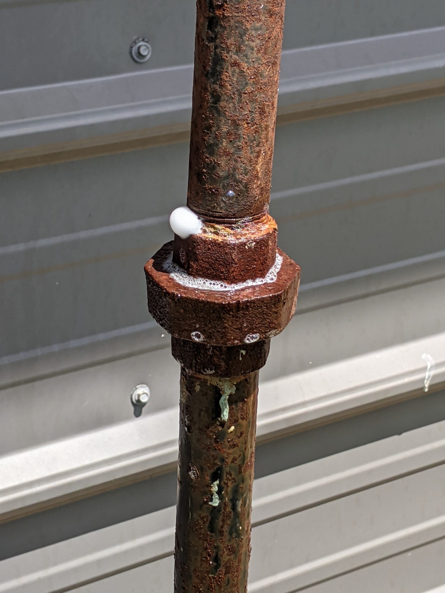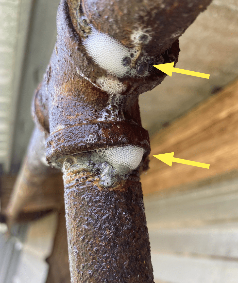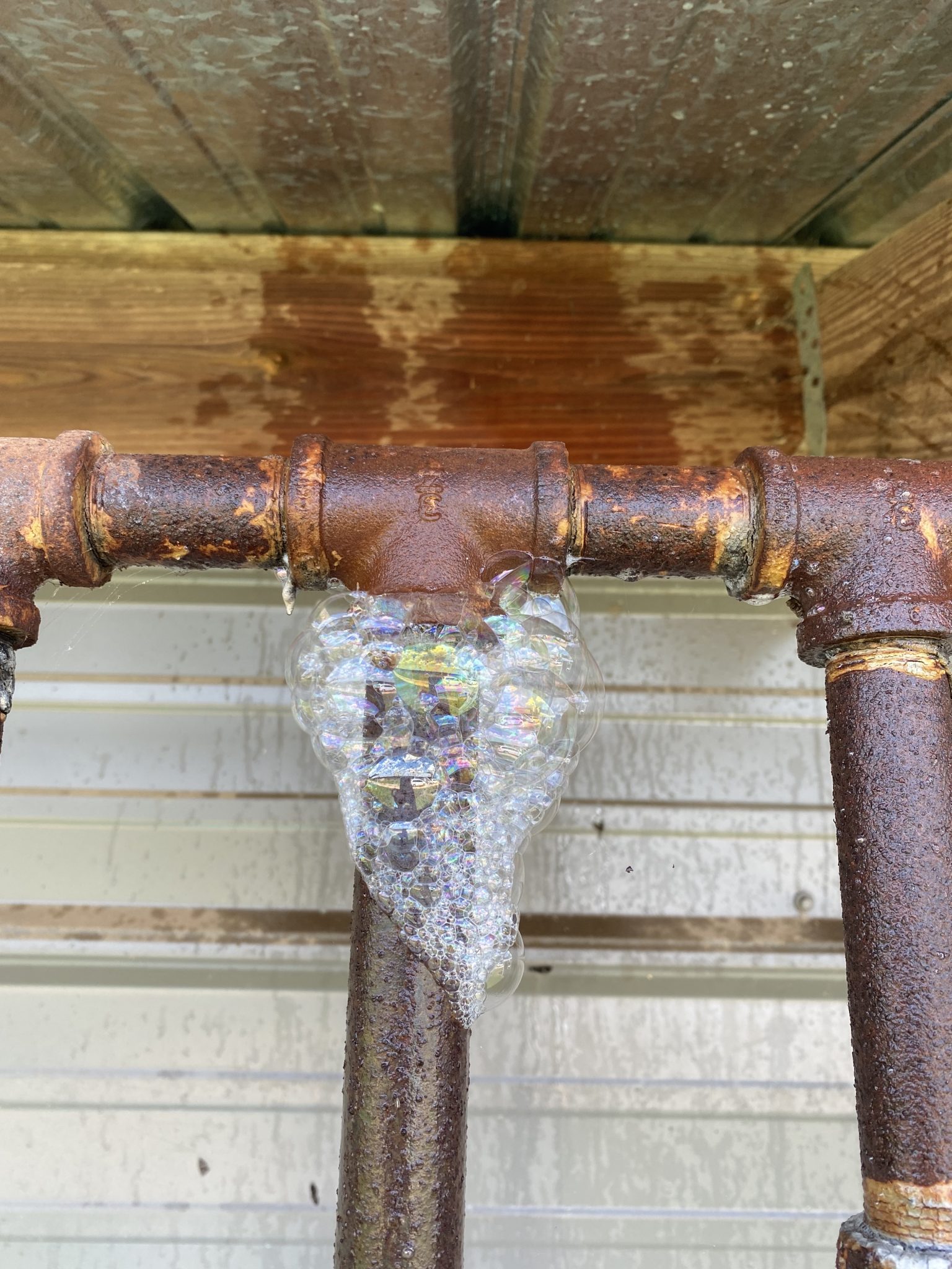 2. Begin the gas check where the gas piping enters the house. Spray all fittings with the soap solution. Depending on the height of the gas line, a ladder may be needed to get to each fitting. Spray every threaded connection: threaded couplings, threaded 90-degree elbows, threaded caps, etc.