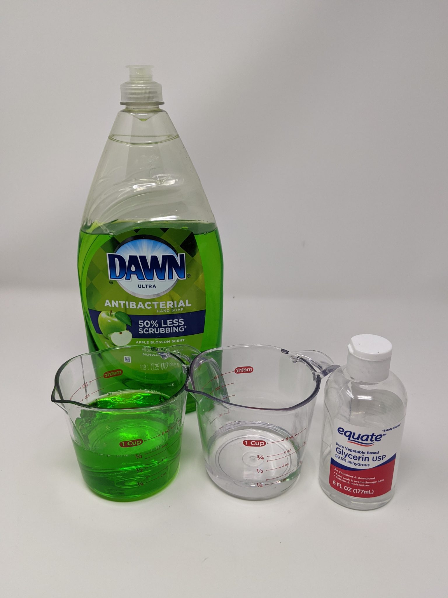 - Figure 2. Measure 3⁄4 cup liquid dish soap (left) in a measuring cup for each gallon of water. You can also add 1⁄4 cup glycerin (right) per gallon of water to improve bubble stability