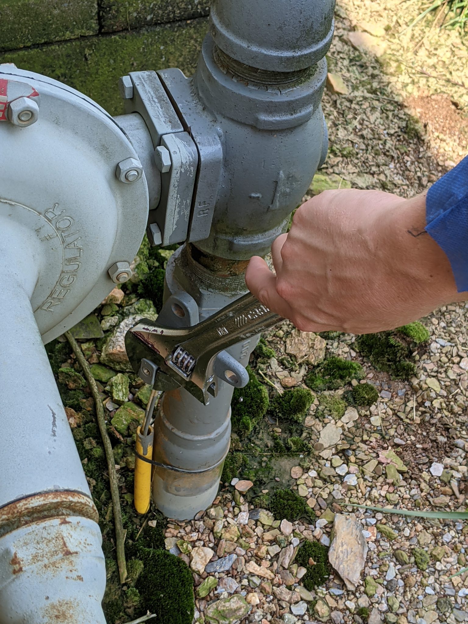 - Figure 5b. Open the shutoff valve entering the natural gas meter with a wrench.