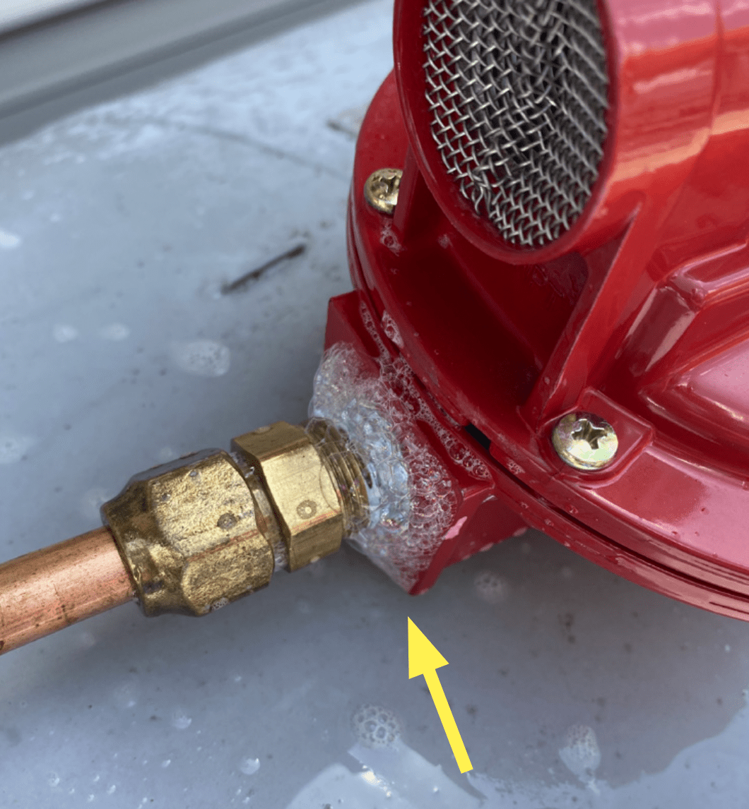 - Figure 7. Check every fitting on all regulators. This shows a leak coming out of the 10 psi regulator leaving the propane tank.