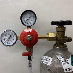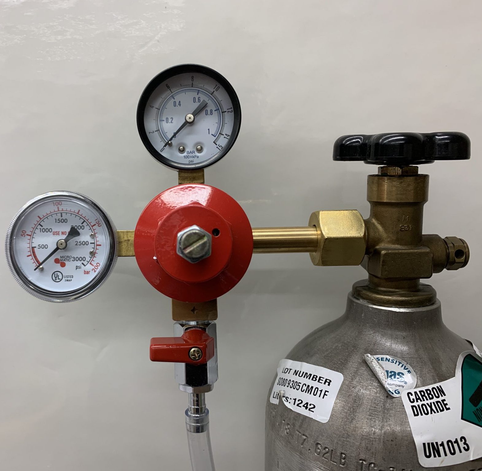 - With the other hands lightly open the regulator valve until CO2 release is audible for 20 seconds. Then close the valve.