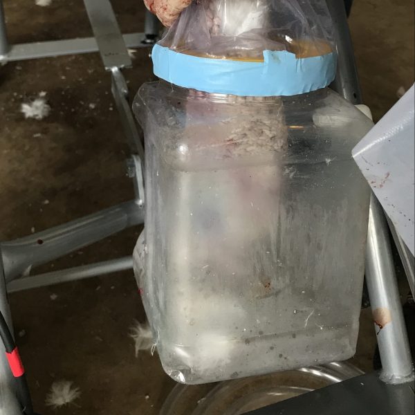 Figure 13. The head and neck of the bird are inserted into the plastic container. The operator gently holds the bag around the neck while applying the carbon dioxide.