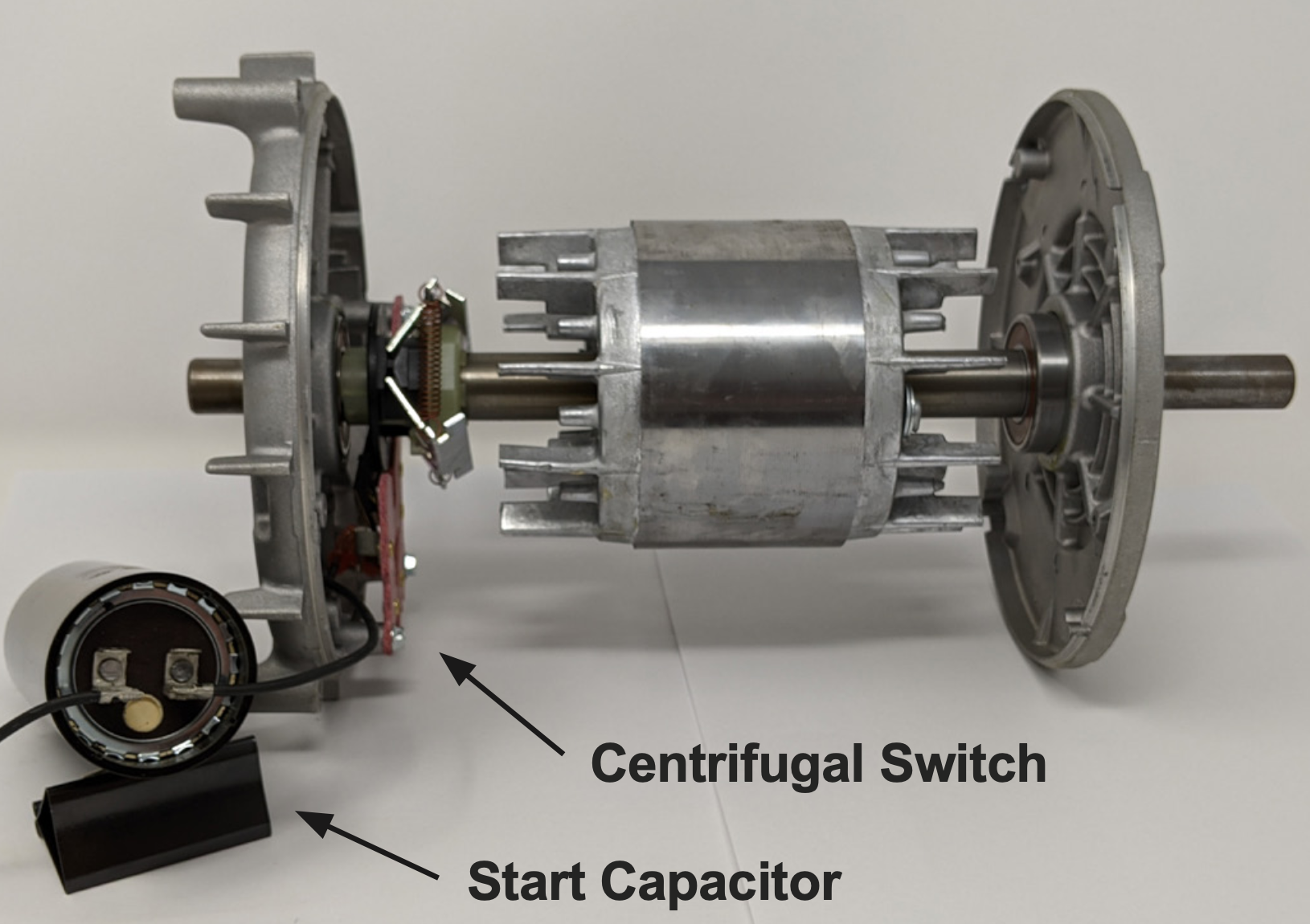 Figure 5. Simplified illustration of a motor with a start capacitor (left); 1 hp motor with a start capacitor (right). (Adapted from MEO, 2015.)
