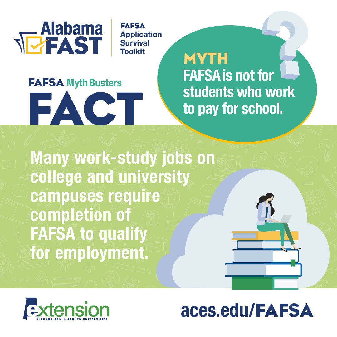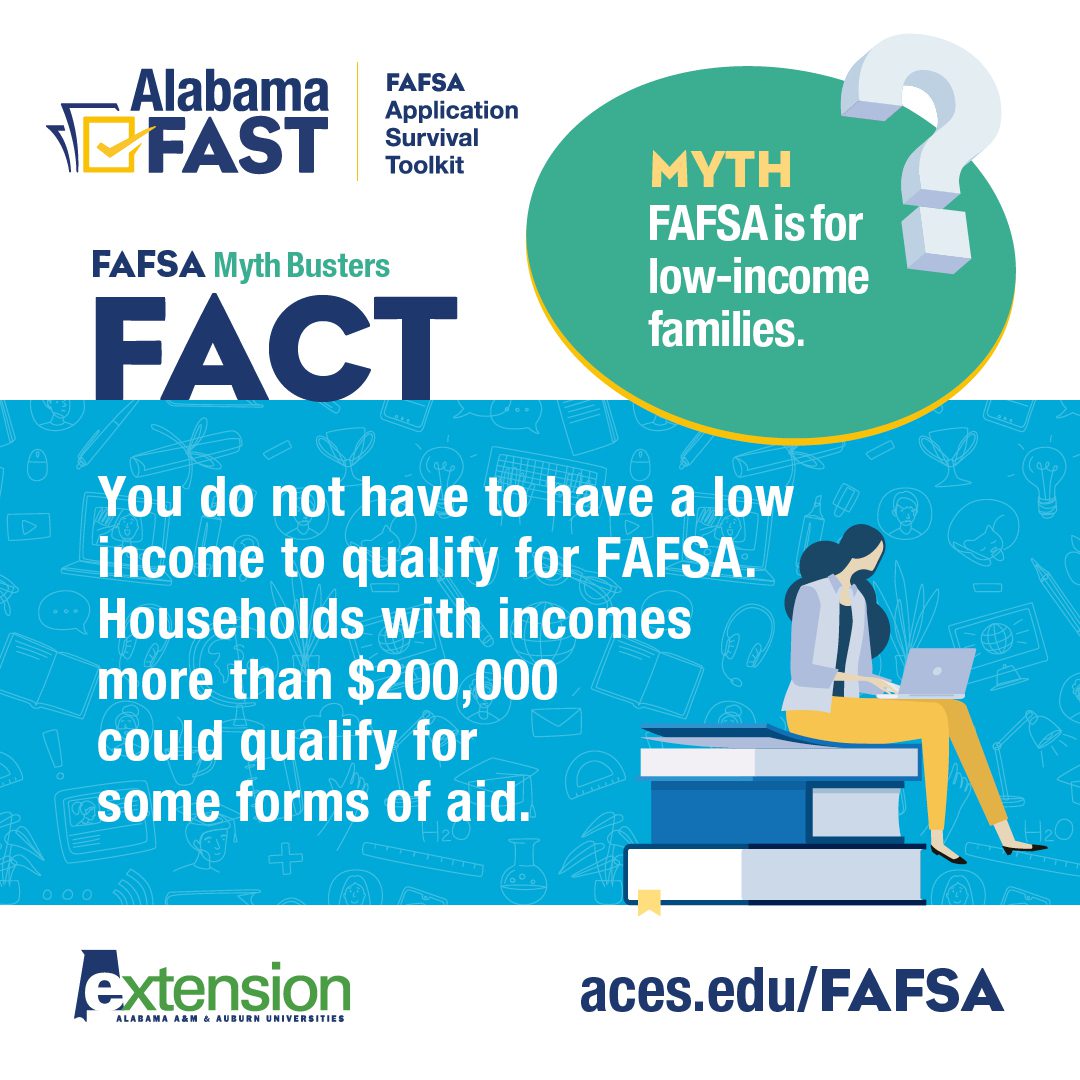 Myth: FAFSA is for low-income families. Fact: Households with incomes of more than $200,000 could qualify for some forms of aid. For more on these and other common FAFSA myths, visit www.aces.edu/fafsa