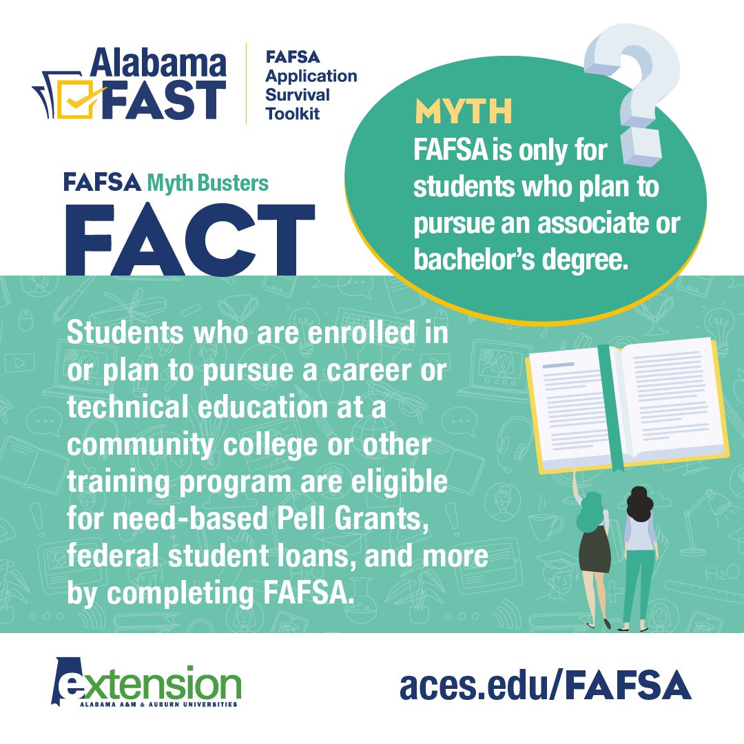 Myth: FAFSA is only for students who plan to pursue an associate or bachelor’s degree. Fact: Several programs at 2-year community or technical colleges qualify for aid. For more on these and other common FAFSA myths, visit www.aces.edu/fafsa